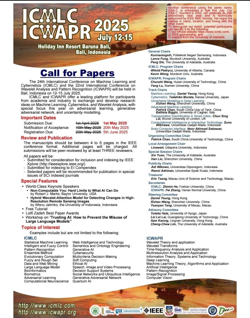 Kami mengundang Anda untuk berkontribusi dalam The 24th International Conference on Machine Learning and Cybernetics (ICMLC) dan The 22nd International Conference on Wavelet Analysis and Pattern Recognition (ICWAPR) yang akan diselenggarakan di Bali, Indonesia pada 12-15 Juli 2025.