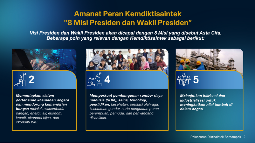 Jakarta, 2 Mei 2025 — Kementerian Pendidikan Tinggi, Sains, dan Teknologi (Kemdiktisaintek) resmi meluncurkan Program DIKTISAINTEK sebagai langkah strategis transformasi riset dan inovasi di lingkungan Perguruan Tinggi Keagamaan Islam (PTKI). Program ini diresmikan langsung oleh Menteri Pendidikan Tinggi, Sains, dan Teknologi, sebagai bagian dari komitmen pemerintah dalam menciptakan SDM unggul dan mendukung pembangunan nasional berbasis ilmu pengetahuan.